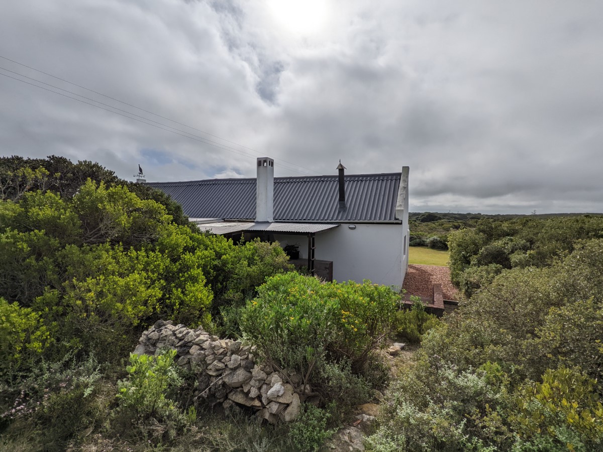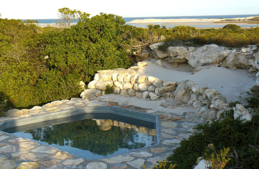 Plunge pool on the rise behind the cottage with view of the Heuningnes River mouth